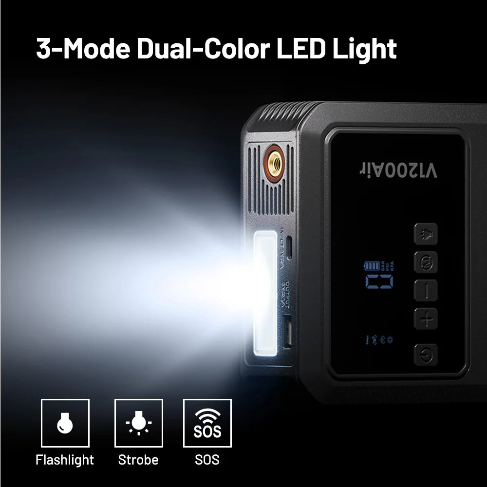 Beyond jump starting and inflation, the V1200 Air doubles as a portable power bank for charging phones, tablets, and accessories, and includes a bright LED torch with emergency modes, making it ideal for roadside breakdowns, camping, and travel.