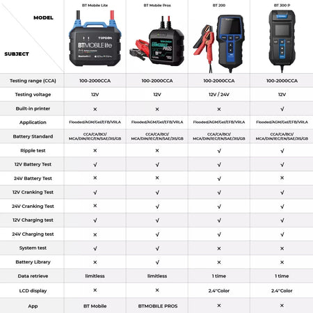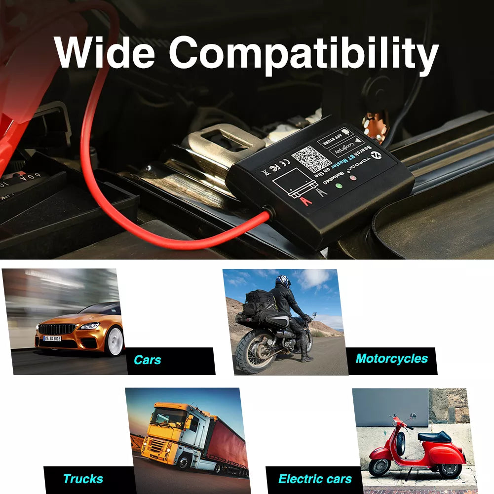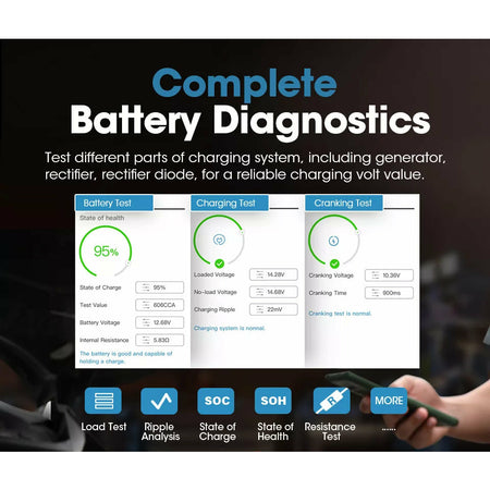 - This device supports 12V batteries, performing battery, cranking, and charging tests on cars, motorcycles, boats, and much more!