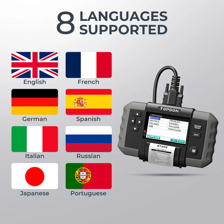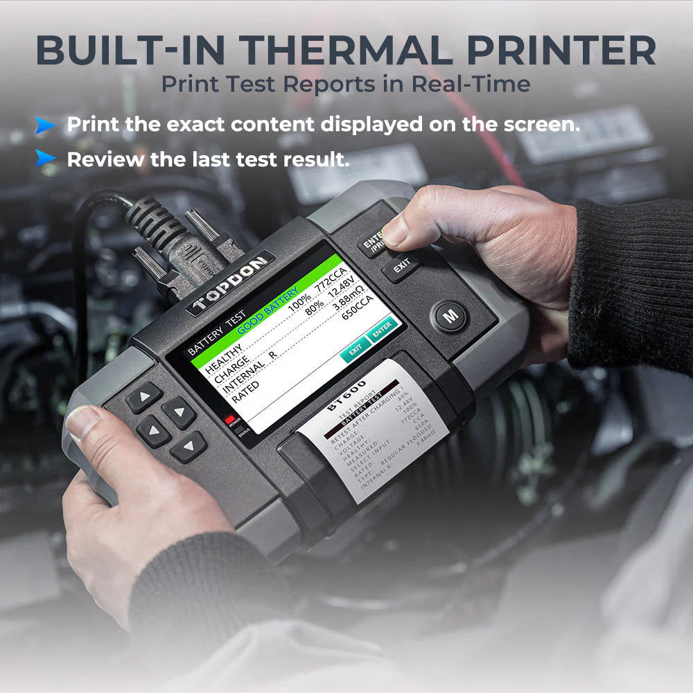 The BT600 is TOPDON’s newest advanced battery tester for 12V vehicles. With a 3.5 inches color screen and a built-in thermal printer, this tool offers the ultimate solution for accurate, fast, and convenient testing. It allows you to easily view the battery's condition and print test reports in real-time.