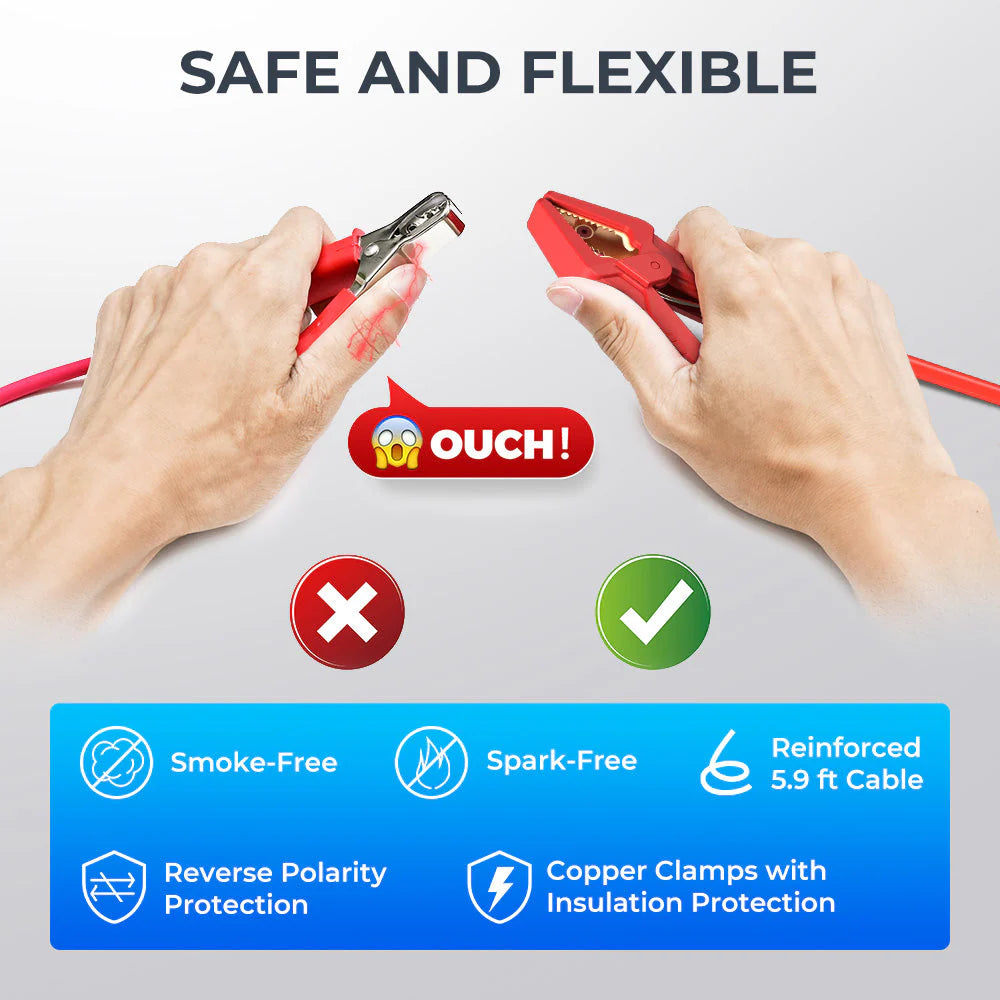 - The device come with premium large, reinforced, smoke-free, spark-free copper clamps. Its reverse polarity protection will prevent battery damage, saving you money from repair and replacement.