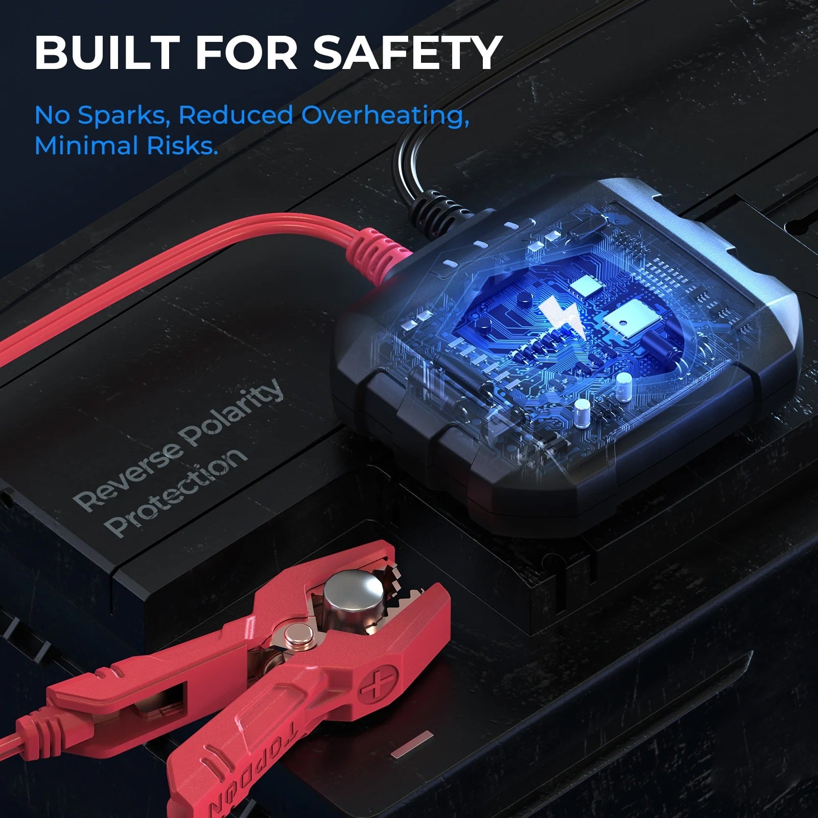 - Safety is built into every feature. The spark-free battery clamps provide added protection along the entire test procedure. Reverse polarity protection saves batteries and battery testers from being damaged by high-power currents.