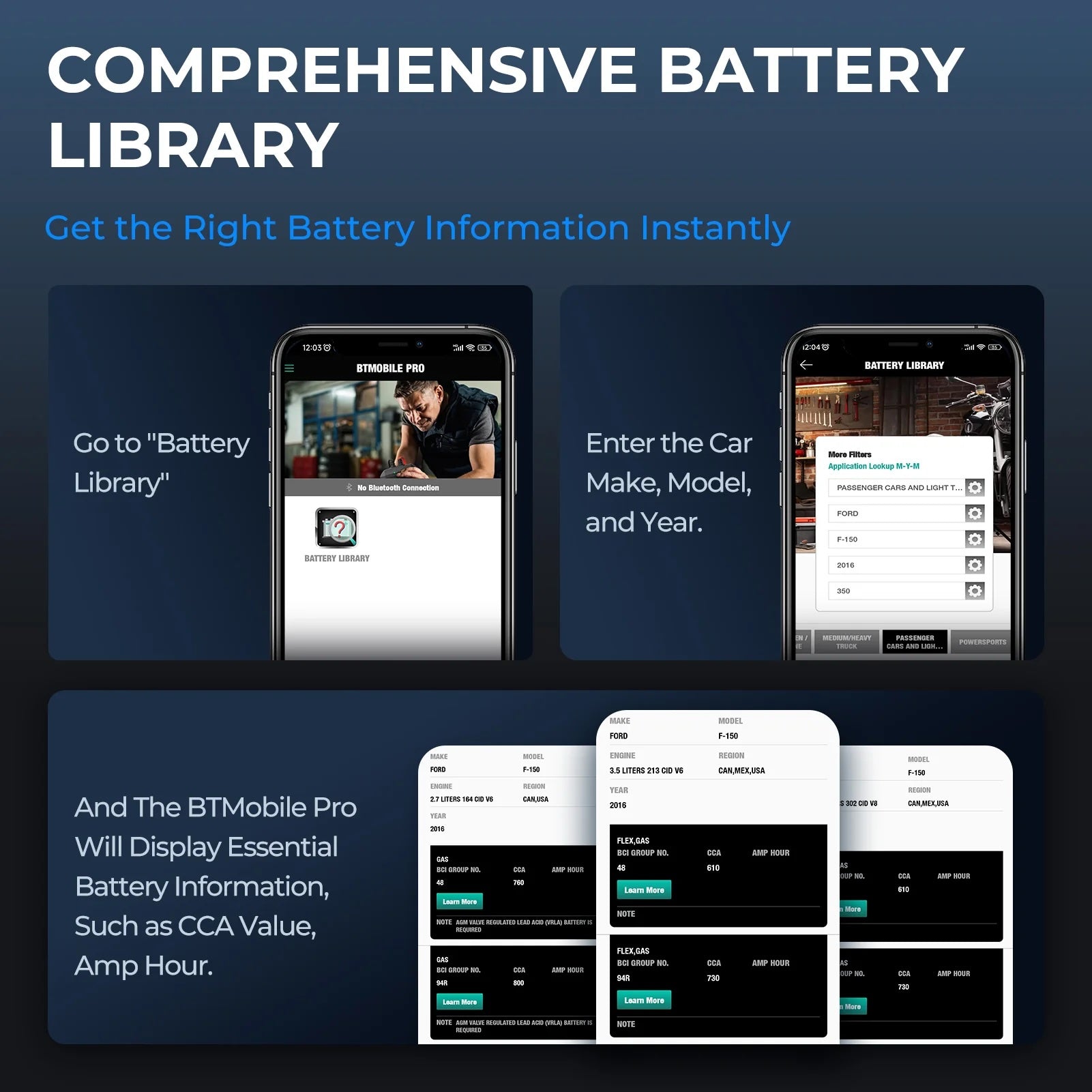 - Comprehensive Battery Library: Even if a battery label is unrecognizable, the BTMobile Pro's battery library has extensive coverage to find your battery's most important information.
