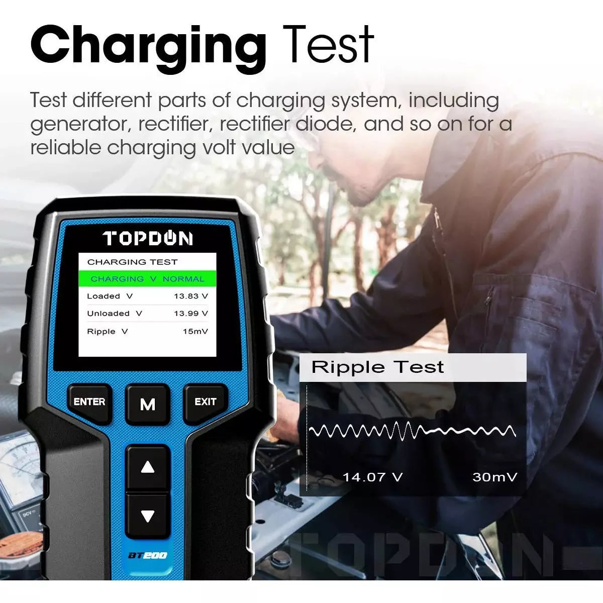 High precision amplifiers calibrated by professional instruments give reliable results in seconds! Key test results include the battery test, the health status test, and the diagnosis of both cranking tests, charging tests, and other functions.