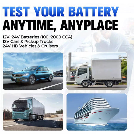 The tool is suitable for battery testing 12V with up to 2000 Cold Cranking Amps (CCA) , cranking testing and charging testing 12V&24V batteries.It can test Regular Flooded, AGM, GEL, EFB and VRLA batteries. Test results are based on CCA, DIN, JIS, EN, IEC, GB, SAE, MCA, BCI and CA Standards.