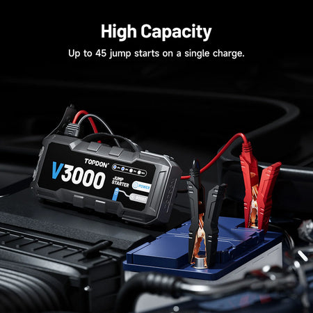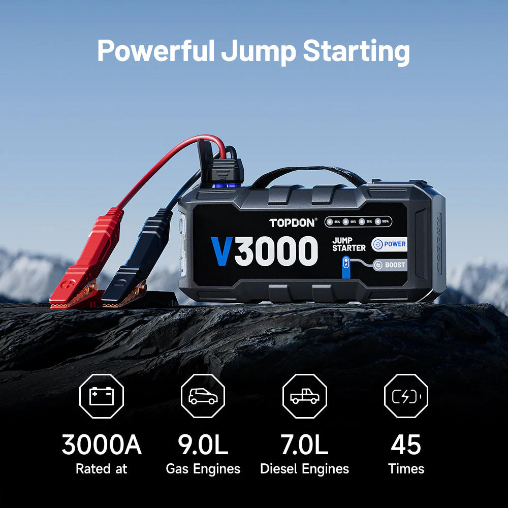 - Equipped with 3000 peak amps and 750A sustained current, the TOPDON V3000 can revive dead batteries in seconds. Whether you’re dealing with a tractor, SUV, or a standard car, this high-capacity car battery booster delivers up to 45 jump starts on a full charge. The powerful lithium-ion battery means longer-lasting performance with faster recharge times.