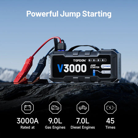 The V3000 is a high-performance 3000 peak amp jump starter. It's designed to reliably start 12V vehicles, including cars, SUVs, trucks, pickups, and RVs, with up to 9.0L gas and 7.0L diesel engines. Whether you’re a first-time driver, senior motorist, weekend adventurer, or seasoned pro, the V3000 delivers the power, versatility, and reliability you can count on
