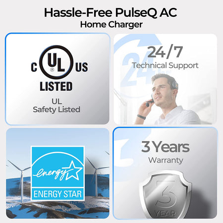 - PulseQ charger is safe and durable with CE-EMC, LVD, RED, and RoHS certifications. The PulseQ has also passed REACH testing, allowing you to charge your vehicles with peace of mind.