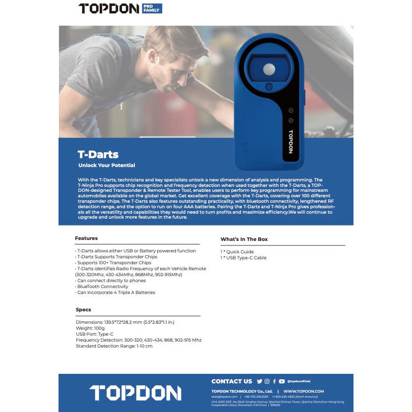 The T-Ninja Pro supports chip recognition and frequency detection when used together with T-Darts (optional), a TOPDON-designed Transponder & Remote Tester Tool, enabling users to perform key programming for most automobiles available on the global market.