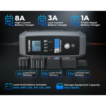 - The TB8000 offers two charging currents of 8A and 3A for batteries from 15Ah to 260Ah.