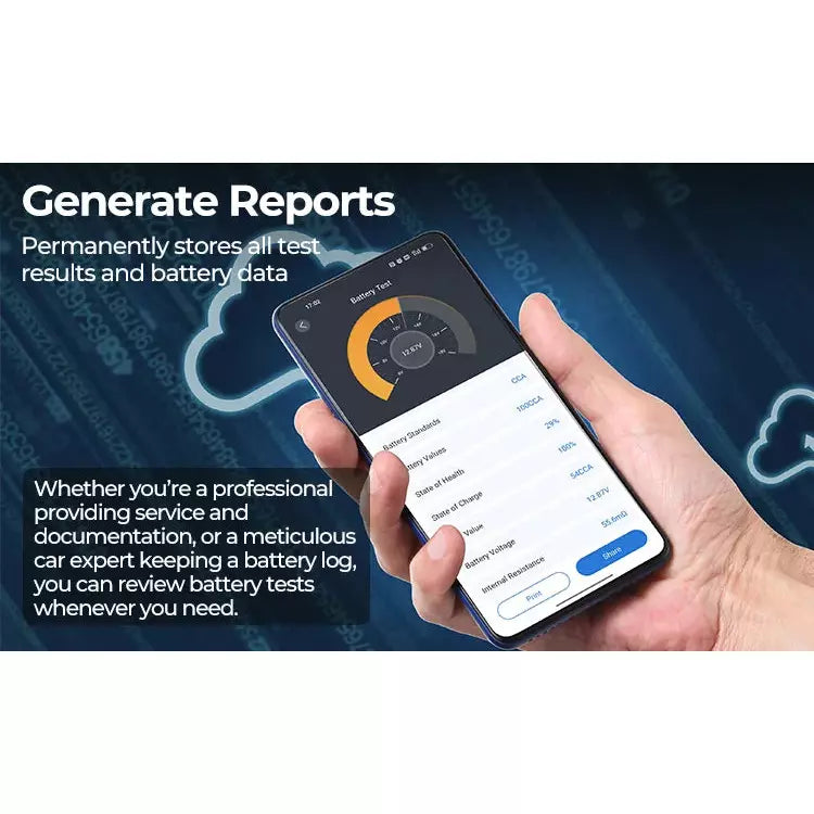 Use the app to perform detailed battery tests before a battery needs to be replaced. Analyze a battery’s voltage, state of health, and state of charge with charging tests. Use cranking tests to monitor cranking times and cranking voltages. The testing capabilities do not stop there. Check cold cranking amps to the rated CCA, and the overall battery health status for precise knowledge of a 12V battery.